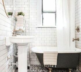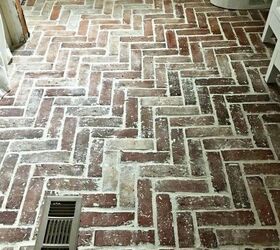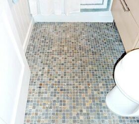 Not into paint or patterns? Well, there are plenty of other bathroom floor tile ideas to choose from, like this interesting brick veneer. If you’re a fan of rustic decor, this just might be the one for you. The thin brick tiles can be laid out in any pattern you choose and they go down just like a standard tile. Hometalk DIYer Adrienne Carrie Hubbard, from Crafty Little Gnome, set hers in a 90-degree herringbone pattern to minimize cuts and sealed her tiles twice, once before she grouted them and once after. Their rugged, outdoorsy texture is paired with her wide planked walls to perfection.