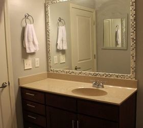 Many bathrooms come with generic mirrors screwed into the wall. Since mirrors can be very expensive, sometimes it makes sense to just update the mirror that you have. Here is how I added a tile frame to an existing builder grade mirror.